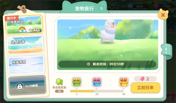 四、點(diǎn)擊寵物場(chǎng)景右下角的“寵物旅行”按鈕,打開旅行界面,左側(cè)有很多可供選擇的旅行地點(diǎn)。不同地點(diǎn)需求寵物數(shù)量不同,隨著寵物等級(jí)提升,派遣幸運(yùn)值也會(huì)增加,帶回來的禮物則會(huì)越來越豐富。