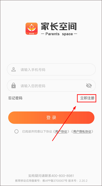 1、下載打開家長空間家長版app,點擊首頁的【注冊賬號】即可進行注冊;