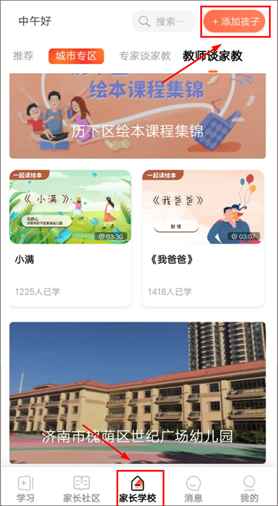 3、進入家長空間app后,家長可在【家長學校】,點擊右上角【添加孩子】,填寫班級碼,進入班級家長群。