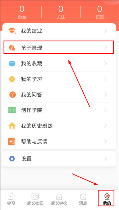 4、如果家長有多個孩子的,可以在【我的】界面,點擊【孩子管理】-【添加孩子】,輸入孩子所在班級的班級碼,重新完成入班即可。
